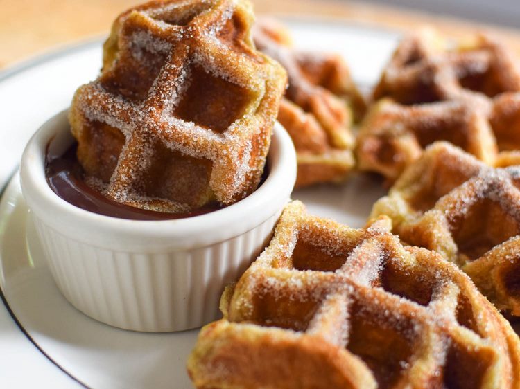 - Serve churro waffles with chocolate sauce.