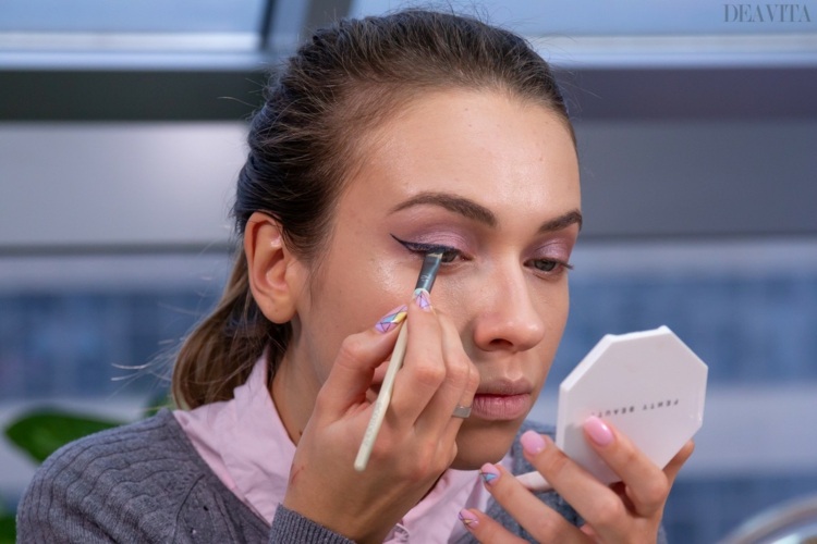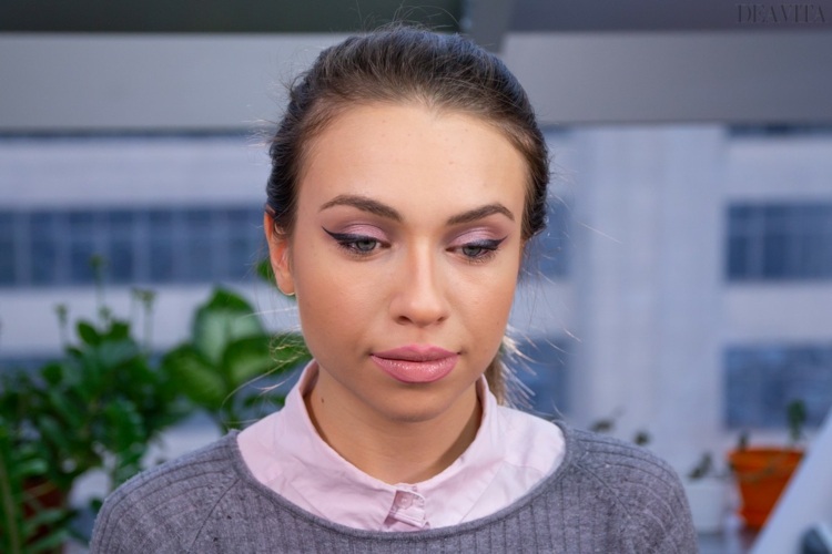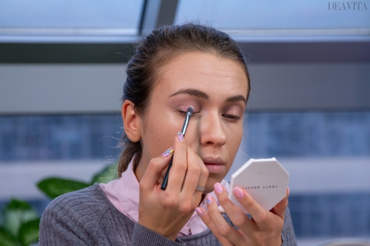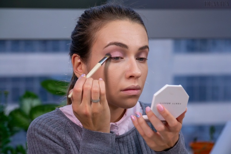 Apply purple-grey matte eyeshadow with a fluffy blending brush.