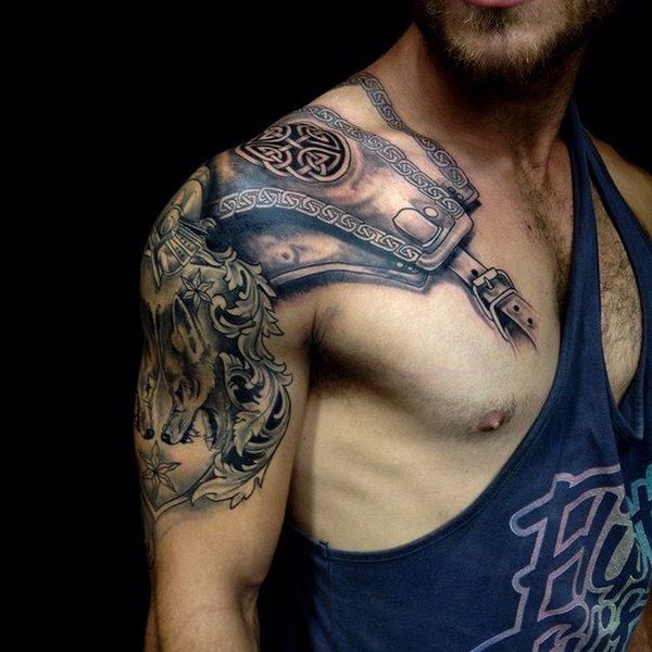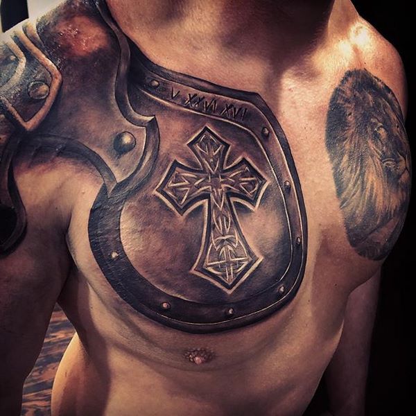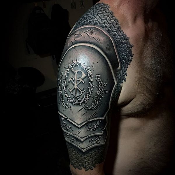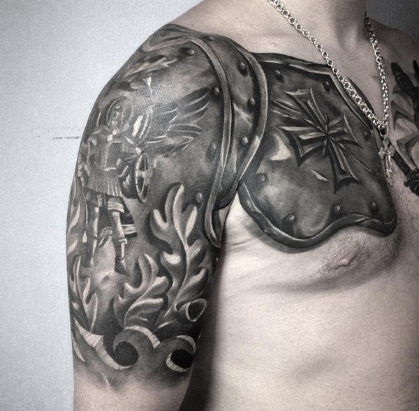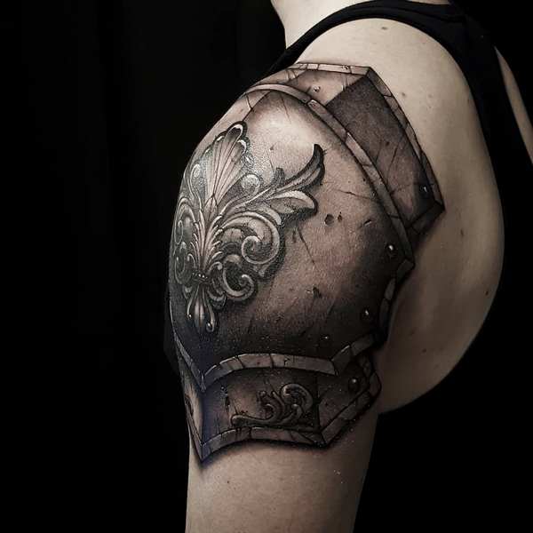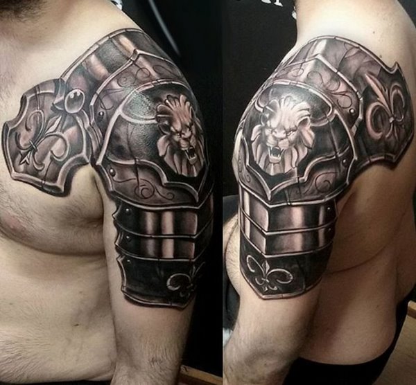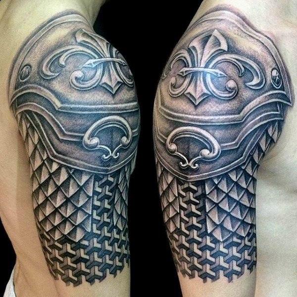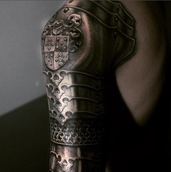 - European knight armor tattoo can be decorated with heraldic symbols. For example, the surface of a shoulder strap may be crowned with a lion which will make the image more aggressive while fleur de lis speaks for nobility, strength, purity of thoughts and generosity.
