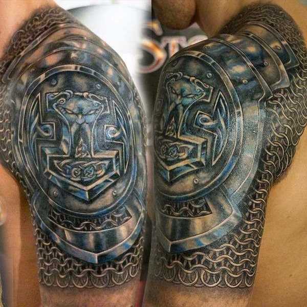 We have to point out that armor tattoos are usually designed as a protective equipment of a certain historical period and reflect the attitude of their owner – a defender, an indestructible warrior or a conqueror. The meaning will depend on the choice of type and image. For example, chainmail symbol may mean love for freedom, flexibility of decisions. A knight’s armor is the choice of men with decisive character who will not give up their position.