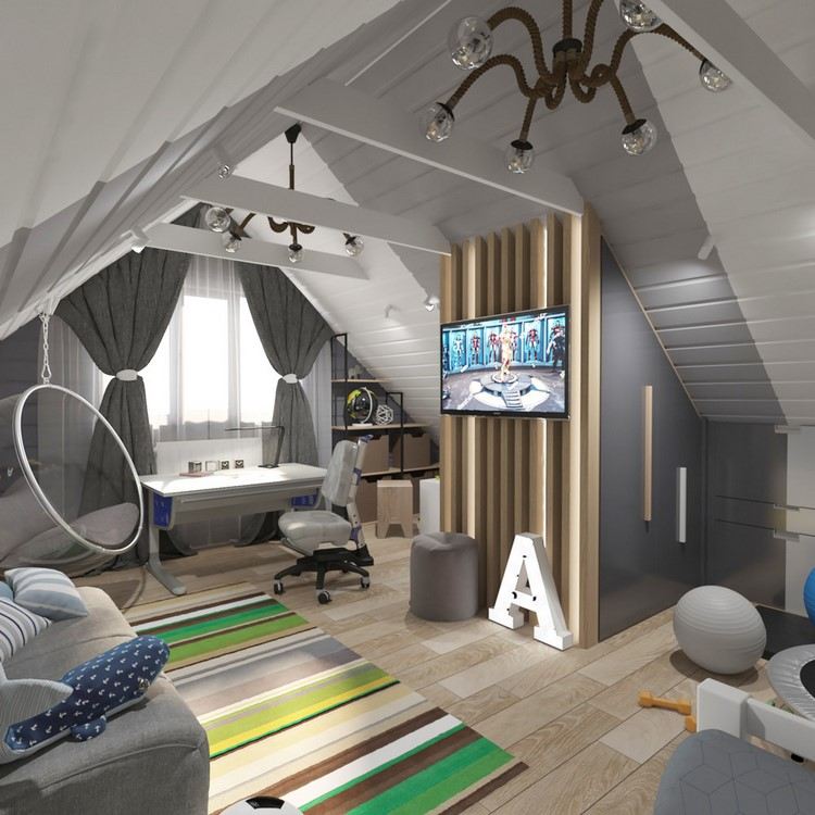 Attic bedroom for boys need to accommodate not only textbooks and clothing but very often, sports equipment and bulkier items. For a boy, the choice of color scheme in the interior plays a significant role. An attic bedroom for a boy can be decorated in neutral shades with some bright accents – bright curtains, pillows or carpet. For a child between 3 and 10 years of age the suitable colors are diluted shades of green, pale blue, white, beige, etc.