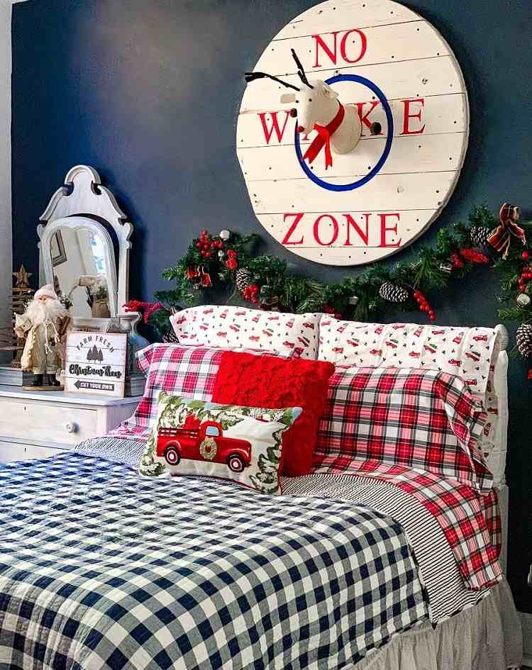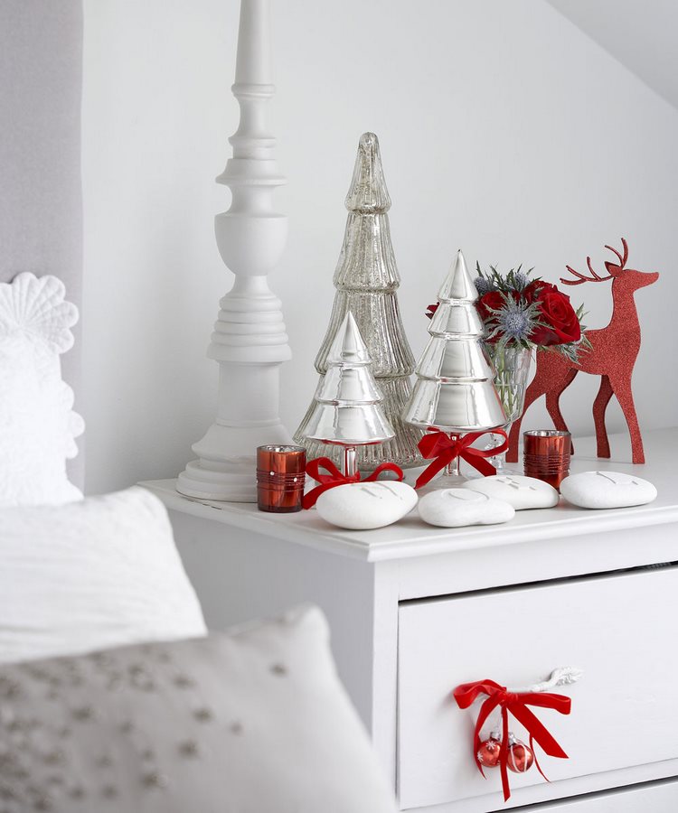 A Christmas tree will instantly make the room more cheerful and festive. The size does not really matter. Typically, bedrooms are not decorated with full size trees but with small ones. Mini Christmas trees or tabletop alternatives are an excellent choice which will not make the room look overloaded.