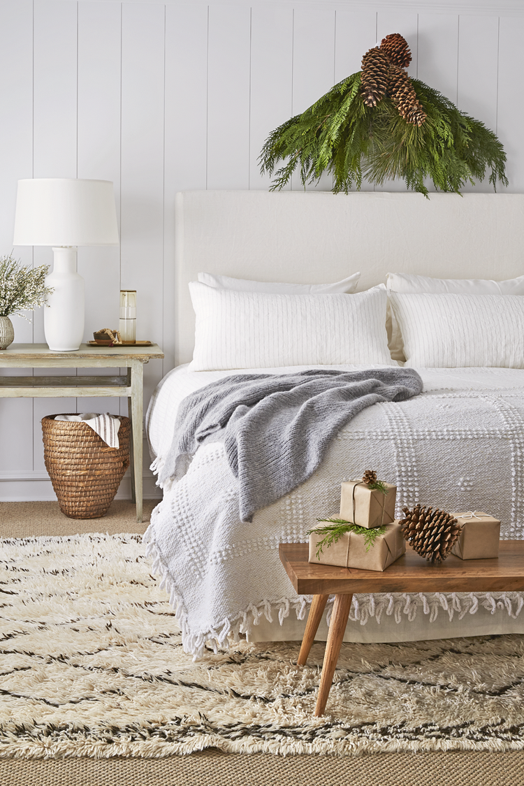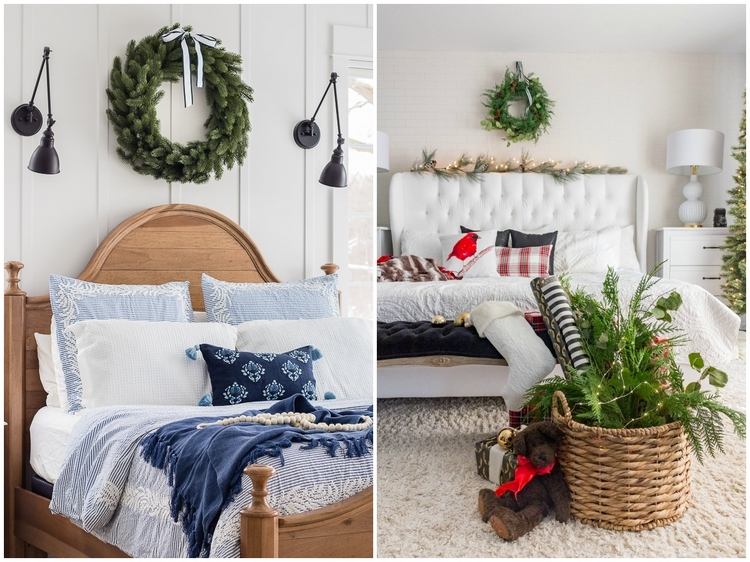 Natural elements are the best for bedrooms. It is better not to use strongly smelling, especially artificial decorations. Compositions from natural materials are a universal decoration and the main task is to choose the ones that are right for you. They can include Christmas tree or pine branches, dry branches of deciduous trees, artificial or real berries, cranberries, cones, dried citrus slices, cinnamon, holly, etc. Here are some tips and Christmas bedroom decor ideas that you can use.