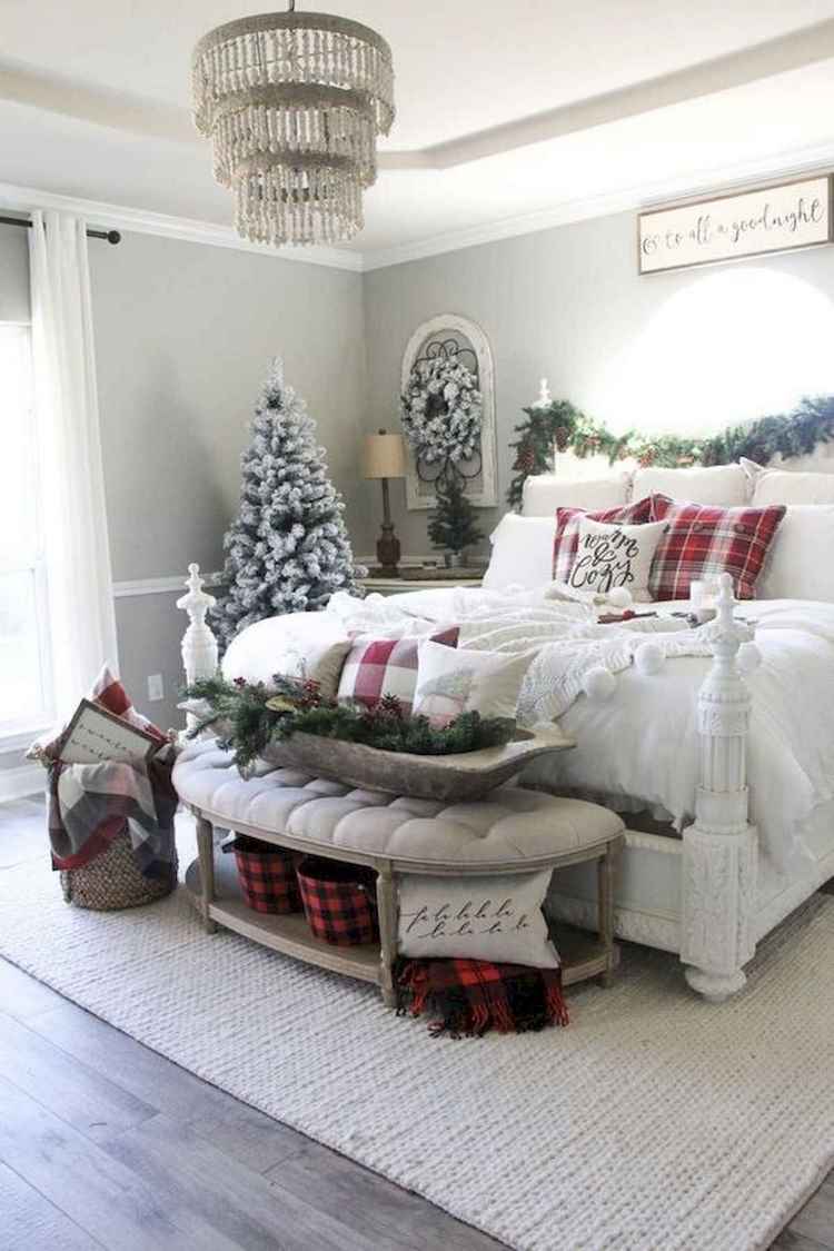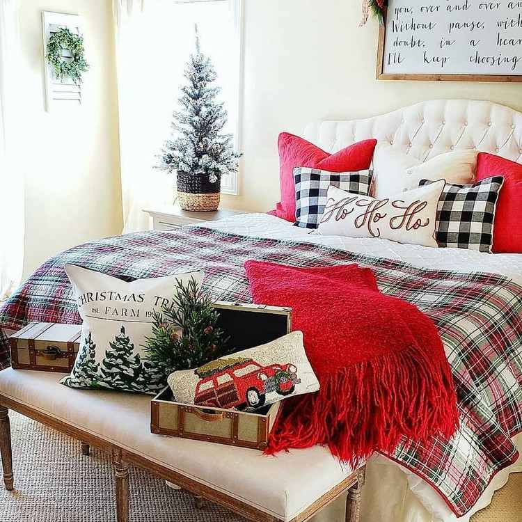 Create bright color spots. Red, green and white are the colors that symbolize the winter holidays. Add them by using textiles. There is a lot of textile in the bedroom, so take advantage of that. Beautiful bedding sets with traditional Christmas prints will help you convey the feeling of winter holidays. Buy pillows and plaid blankets and use faux fur in your bedroom. Blankets, rugs, pillowcases, etc. will make your sleeping place more comfortable and warm. A bench with a fur cover is a great idea