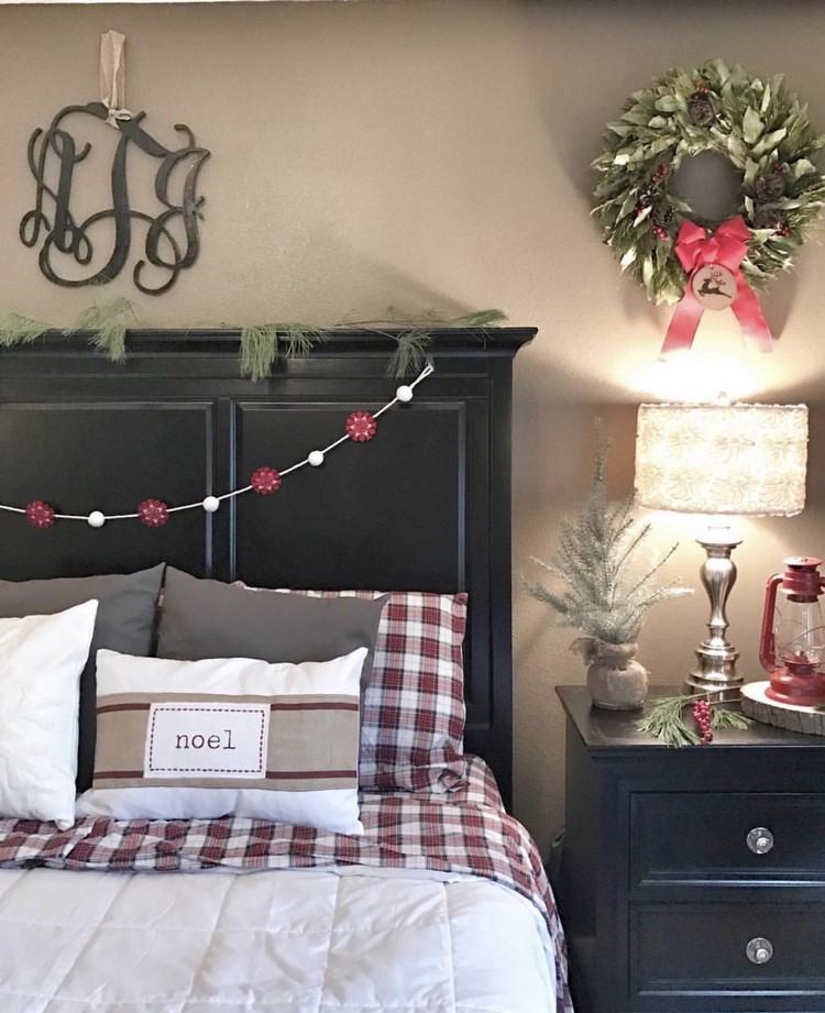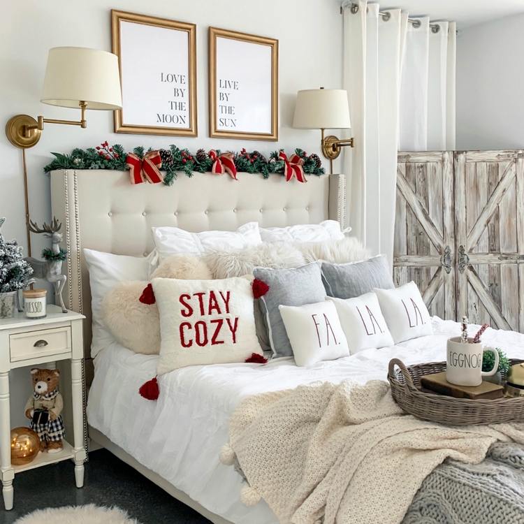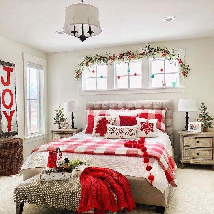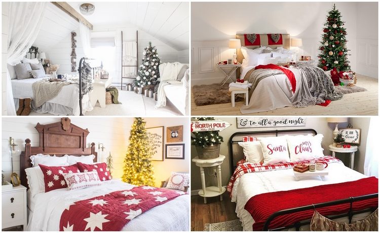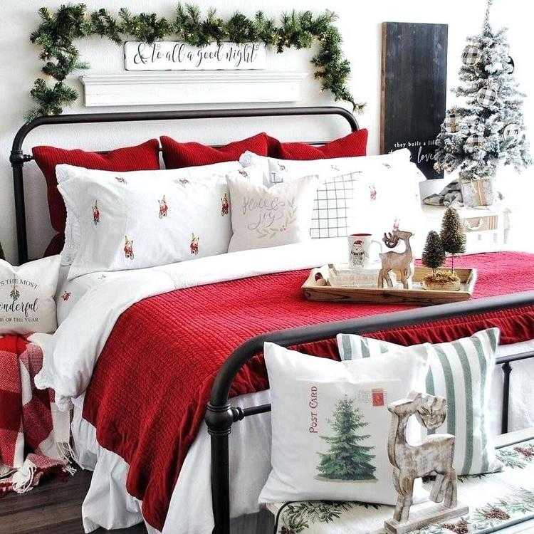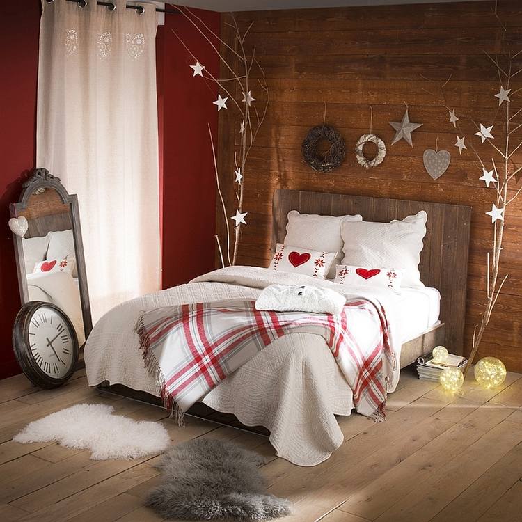 Decorations in classic Christmas colors – red and green, are perfect in bedrooms interiors in warm colors and both light and dark shades.