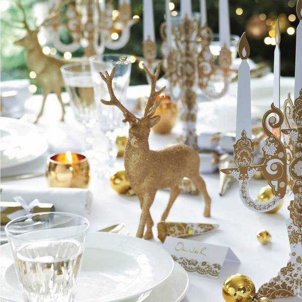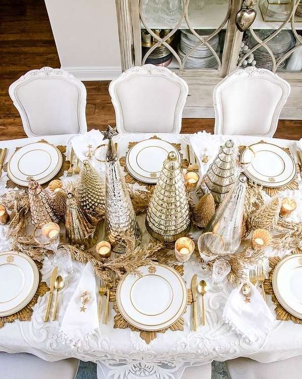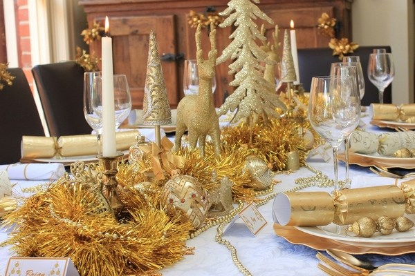 Christmas table decoration in gold can be arranged with the help of numerous accessories and items. For example, gilded trees and gilded ornaments can be arranged as a centerpiece. Another option is to use glass candle holders with golden candles. You can use a golden organza ribbon to tie the small gifts for each of your guests. Get Christmas crackers in gold, tea candle holders, bead garlands, etc. The easiest and most budget friendly option is to buy golden confetti or snowflakes from a craft shop and scatter them on the table.