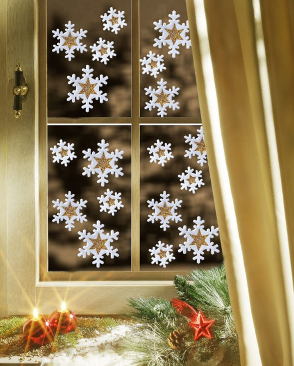 One of the quickest, last minute Christmas decoration ideas for windows is to use stickers and decals. They are available in many shops and are at an affordable price. Christmas window stickers come in a huge variety from simple snowflakes and tree ornaments to landscapes and festive scenes. Window stickers are bright and colorful, often made in a cartoon style, they can be glittering and it takes minutes to arrange them on the windows.