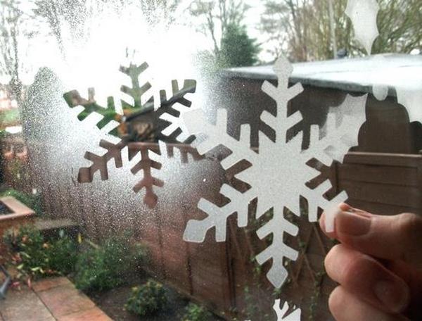 The third way to decorate your windows with winter themed stencils is to use artificial snow