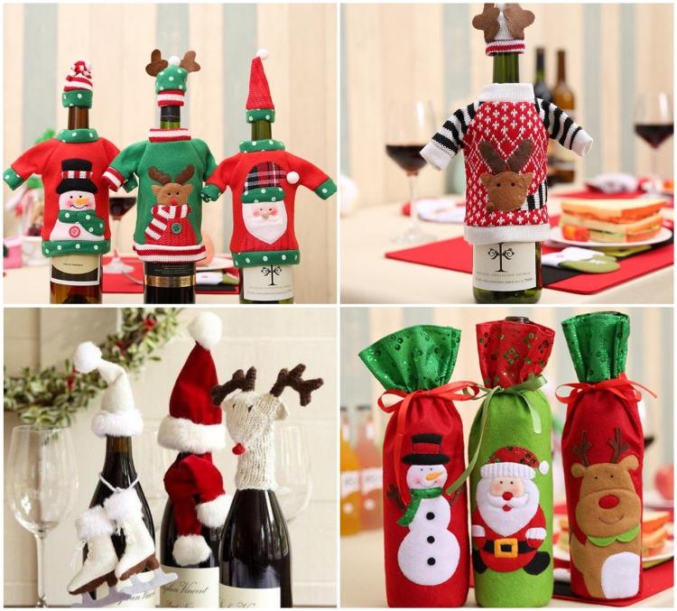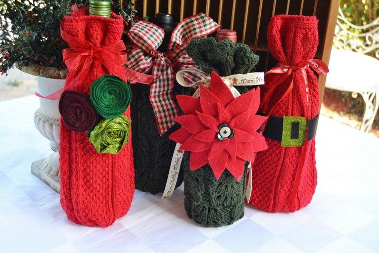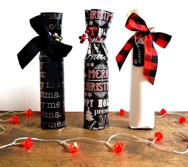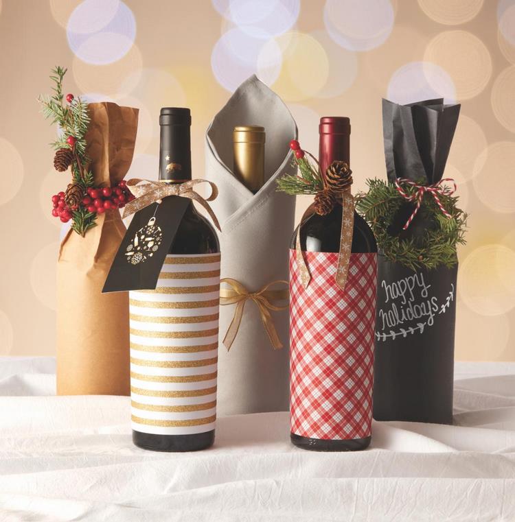 The first thing that comes to mind is to wrap a bottle of wine in Christmas gift paper. There is a very wide selection of patterns, texture and density of wrapping paper in stores and you can make a very beautiful, refined and stylish wrapper for wine.