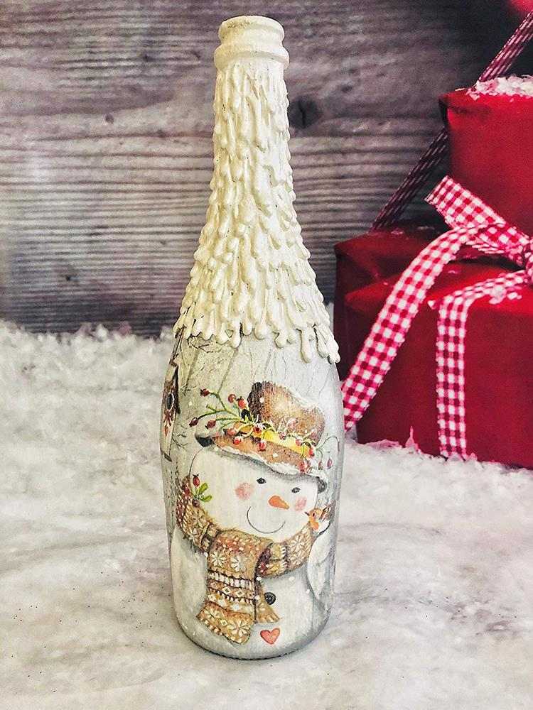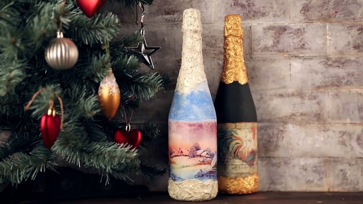 Decoupage technique is not difficult but requires some time. You need paper napkins with Christmas motifs. Cut out the picture and glue it on the bottle. Combine different cut outs to form a composition. All you need is patience and a little imagination to create a really unique masterpiece!