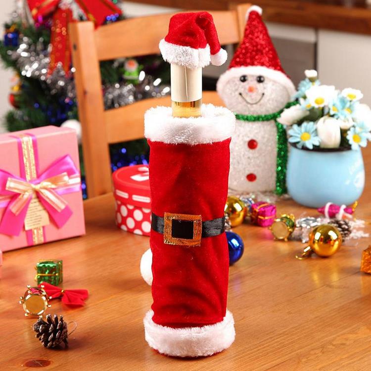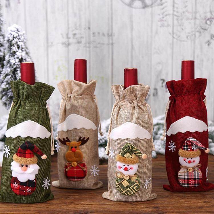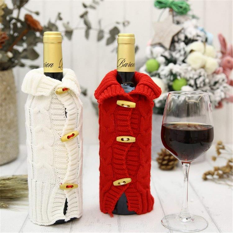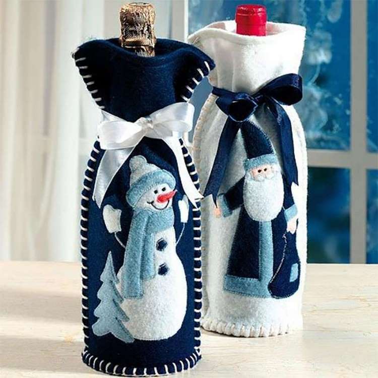 Wine bottle Christmas sleeves are another original option. You can sew a festive bottle sleeve from any fabric – jeans, felt, fur, linen and so on. The top of the bag can be tied with a ribbon or pulled together with ribbons, and the fabric can be decorated with beads or other winter holiday symbols. If you have a large piece of fabric, you may skip sewing. Just wrap the bottle tightly and tie a ribbon around the neck.