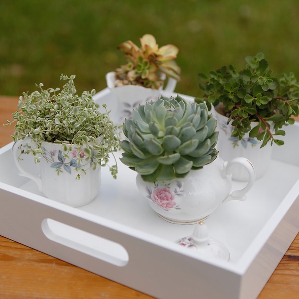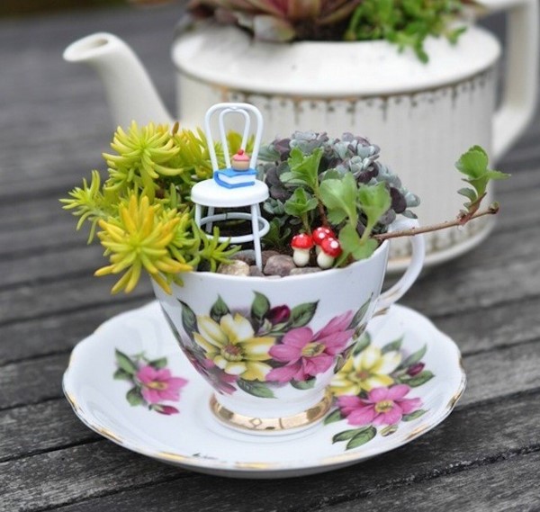 These are just some of the many creative vintage teacup upcycling ideas. In the photo gallery below you will see how to use old teacups for a mini herb garden, for succulent planters, jewelry organizers, you can even make a spectacular clock! Transforming teacups into a magical fairy garden is another great idea. Why not make a cake stand? Teacups can be used for your vintage or Shabby chic wedding decor! Enjoy the photos and get inspired!