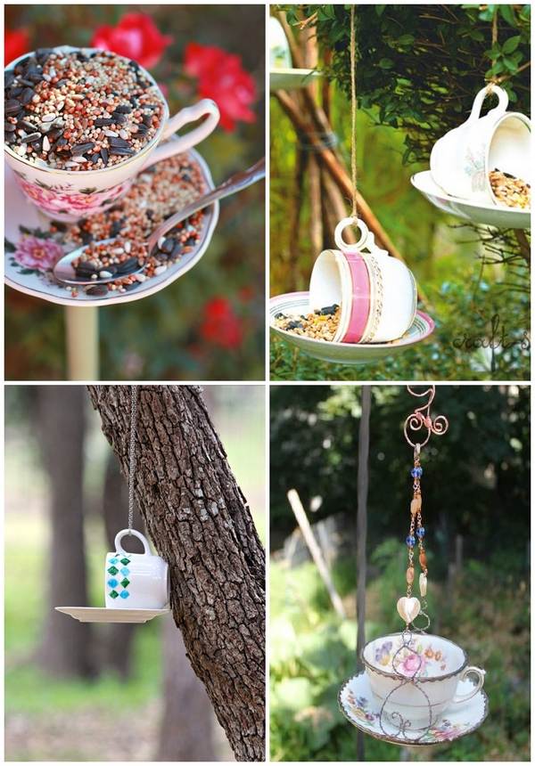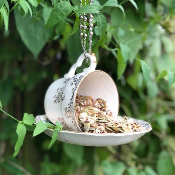 Probably everyone has a cup or saucer with a crack and feels reluctant to throw it away yet they cannot be used any longer. You can find them another application and make a teacup bird feeder. To make a feeder from a saucer and a cup you do not need any skills or DIY experience. You can craft a fantastic garden or balcony decoration, which is also functional, in a matter of minutes! These bird feeders can be hung either on a wire or on hooks or simply on a strong rope.