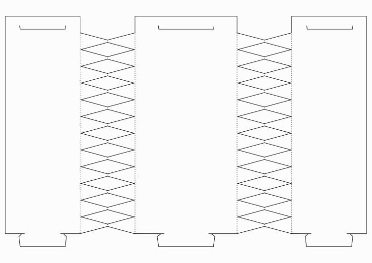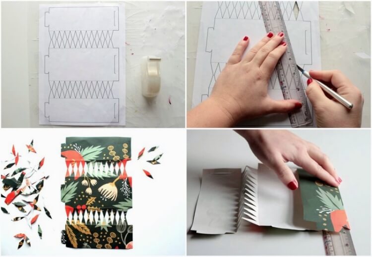 Now it’s time to fold your individual crackers. Using a ruler to guide you, fold along the dotted lines of the pattern. Then fold the diamond area inwards and fold the whole model again as shown in the photo.