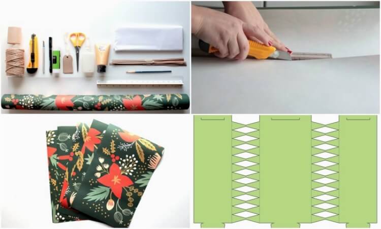 Cut your wrapping paper into sheets of 18 x 28cm. (7 in x 11 in). These dimensions correspond to the size of the crackers if you print the design on a sheet of A4 paper. Place the cutting mat on your work surface and place the wrapping paper on top, printed side down.