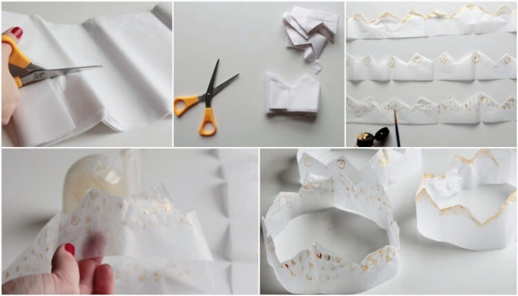 When the decorative designs are ready and dry, cut the strips of tissue paper. They should be about 60 cm (23.6 in) long. If you plan to make crowns for kids as well, just cut them a little smaller. Then, overlap the two ends and join them together with tape to form a circle. When you’re ready, carefully fold the tissue paper crowns so they can fit into the crackers.