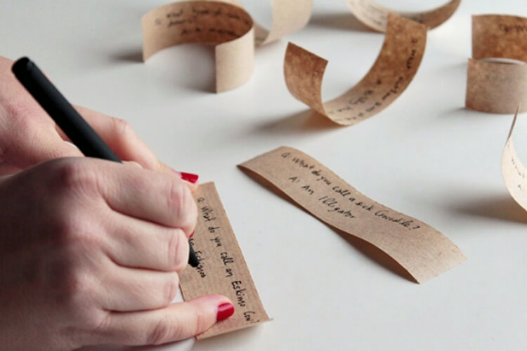 Cut small strips of craft paper. Write a personalized message or joke on each piece of paper. Wrap the paper in a small tube and seal with washi tape.