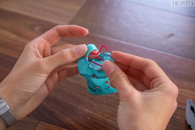 When the wardrobe is done, bend the paper clip with the wire-cutters so that it looks like a small hanger.