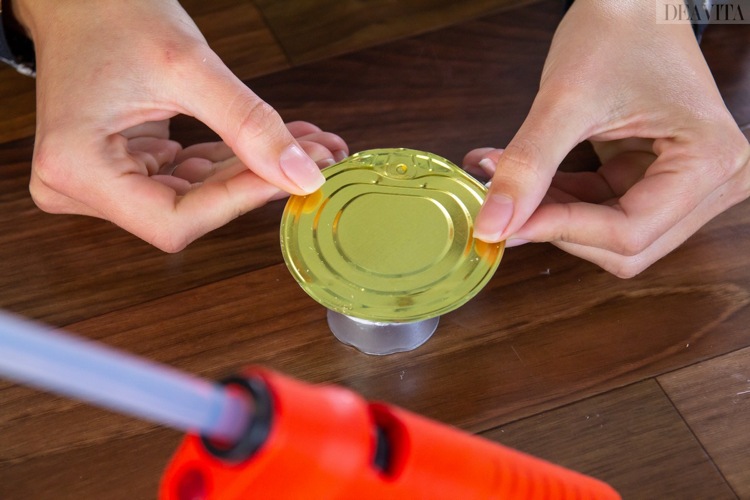 Now place the can lid on the tea candles table base and fix with the hot glue gun. We recommend to a use a file or sandpaper to make the sharp edges safer. Optionally, you can use a plastic can lid for safety.