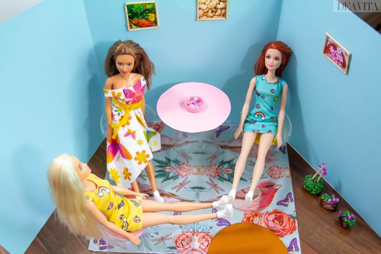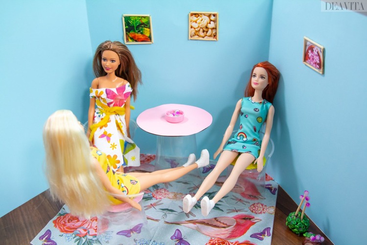 In this cozy dining room Barbie can spend the evening with her friends while having dinner. Decorated with colorful pictures on the walls, cozy house plants and a high-pile carpet made of paper napkin, the room is cozy and inviting. Only the dining table and the chairs are missing.