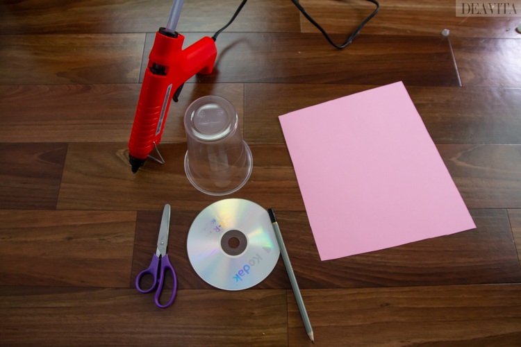 Use the CD as a template and cut a circle out of the cardboard. Glue the pink circle on the CD and let it dry.