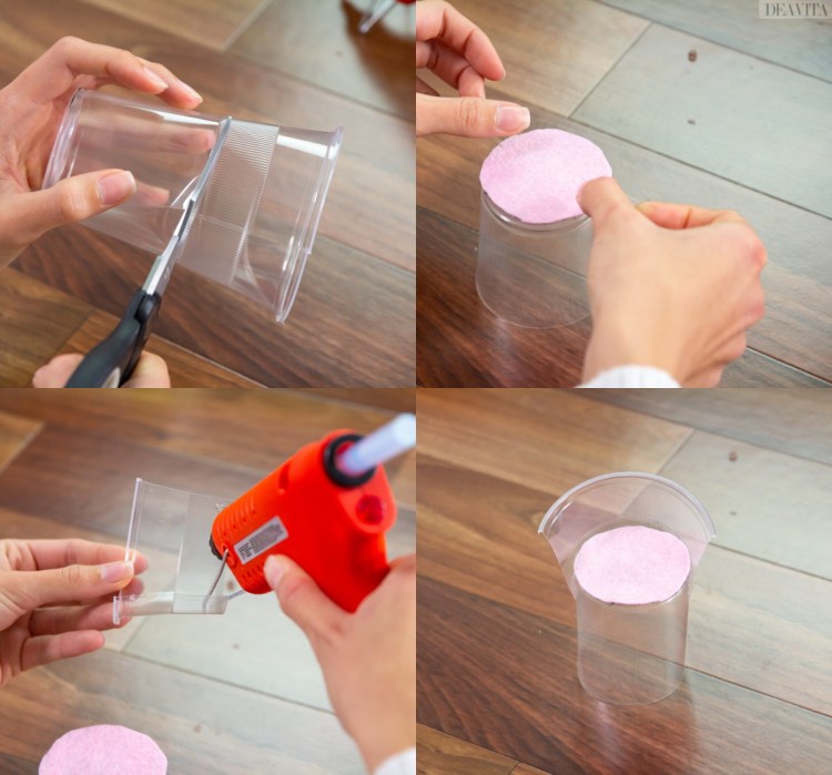 For the four chairs you need four plastic cups, pink felt, scissors and a hot glue gun. Follow the photo tutorial above.
