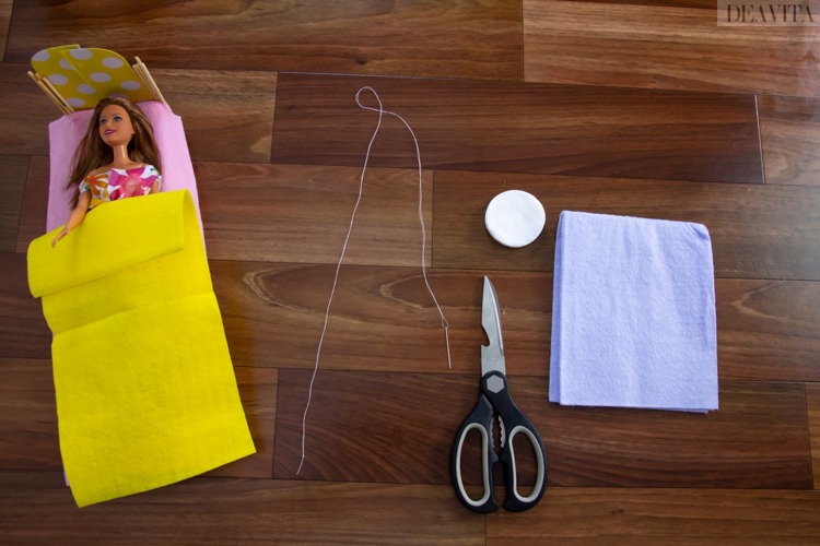 To be as comfortable as possible, Barbie needs a pillow. You can make one very quickly from felt and cotton pads. You need: