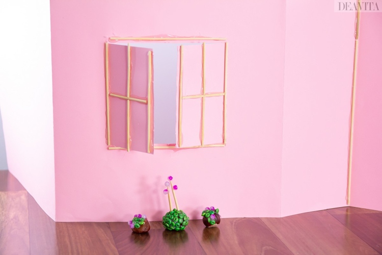 Does the old dollhouse need a house extension – for example, because there is not enough room for all Barbie dolls? Then a guesthouse made of paper offers a fast space solution. Simply cut out the walls from cardboard. For the door and the windows cut openings, glue the door and window sashes with wooden sticks for more stability. Now just assemble the house – and arrange the toys inside.