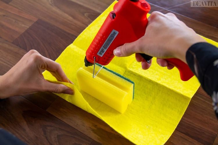 Wrap the sponge with the felt and glue the ends of the fabric together. Cut out a detail from the cardboard for the backrest. If you wish, you can paint it or decorate it with wrapping paper. Secure the cardboard detail with the hot glue gun. Finished!