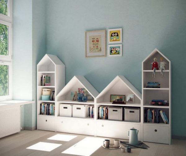 Furniture is all about geometry but you can play with it. You can be really creative when choosing shelves and storage furniture, accessories and decorative elements. For example, triangular shelves will be a great geometric element and will save floor space. You can find many different and original shelving ideas on the internet and if you are skilled at DIY projects, you can easily make a hexagon, squares or houses, even abstract lines and irregular shapes. Whichever design you choose, you will have an original piece of furniture which will also serve as a geometric decoration in the room. In addition, you can paint them in different colors so that your shelves match the color of the rest of the furniture or simply leave the natural wood color and grain. Storage baskets in striped or zigzag pattern or made of fabric with geometric figures is another option for the decor of the nursery room. Look at the gallery below and you will find out many amazing and incredibly creative ideas.