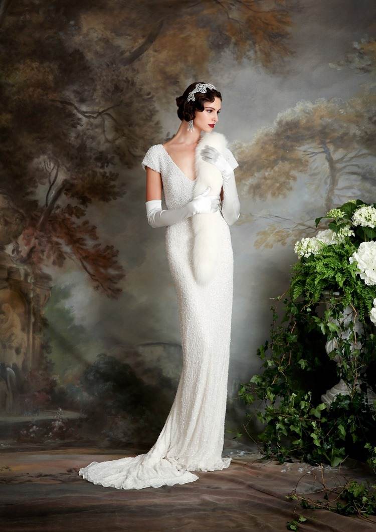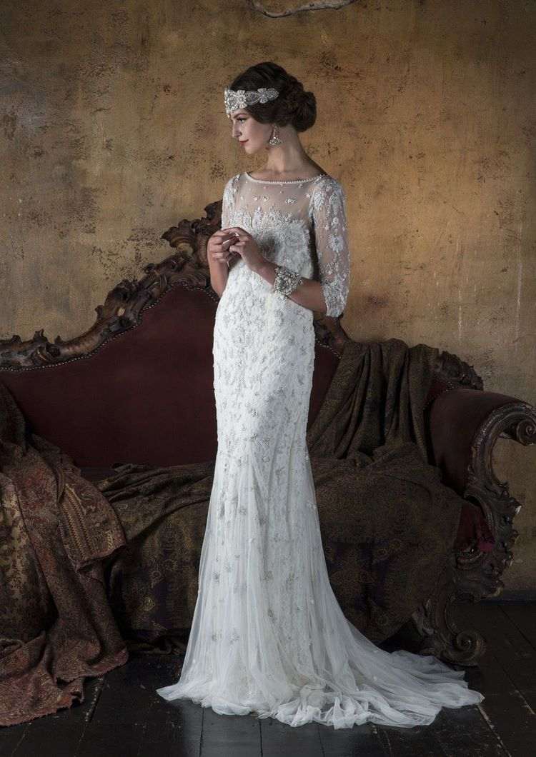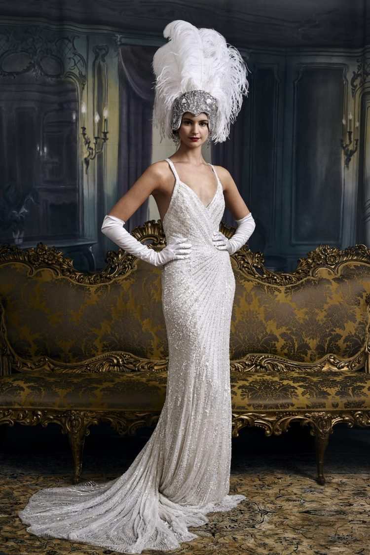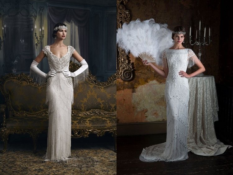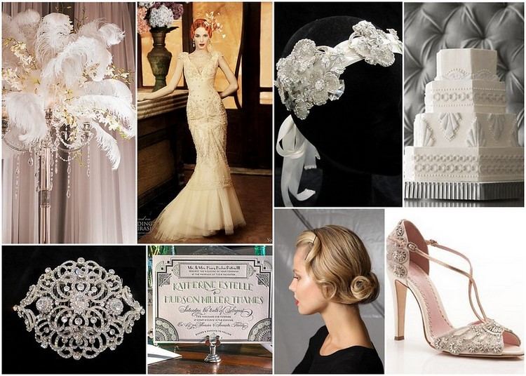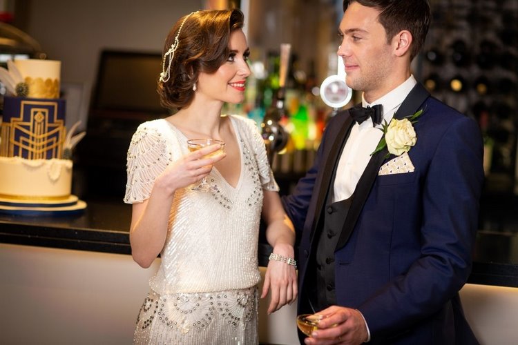 When it comes to the styling of the bride and groom, it should reflect the theme. Their image should be bold and aristocratic. A vintage style wedding dress with simple straight cut, natural, light and flowing fabrics and rich decoration of pearl threads, geometric patterns of glass beads, rhinestones and sequins are used.