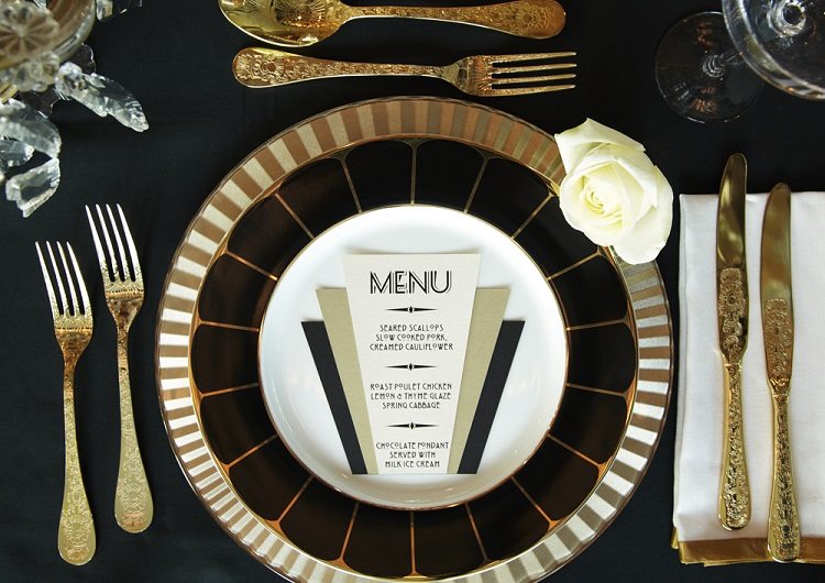 Use vintage fonts, geometric patterns, various Art Deco patterns and gold stamping for the wedding invitations, table numbers, place cards and menu.