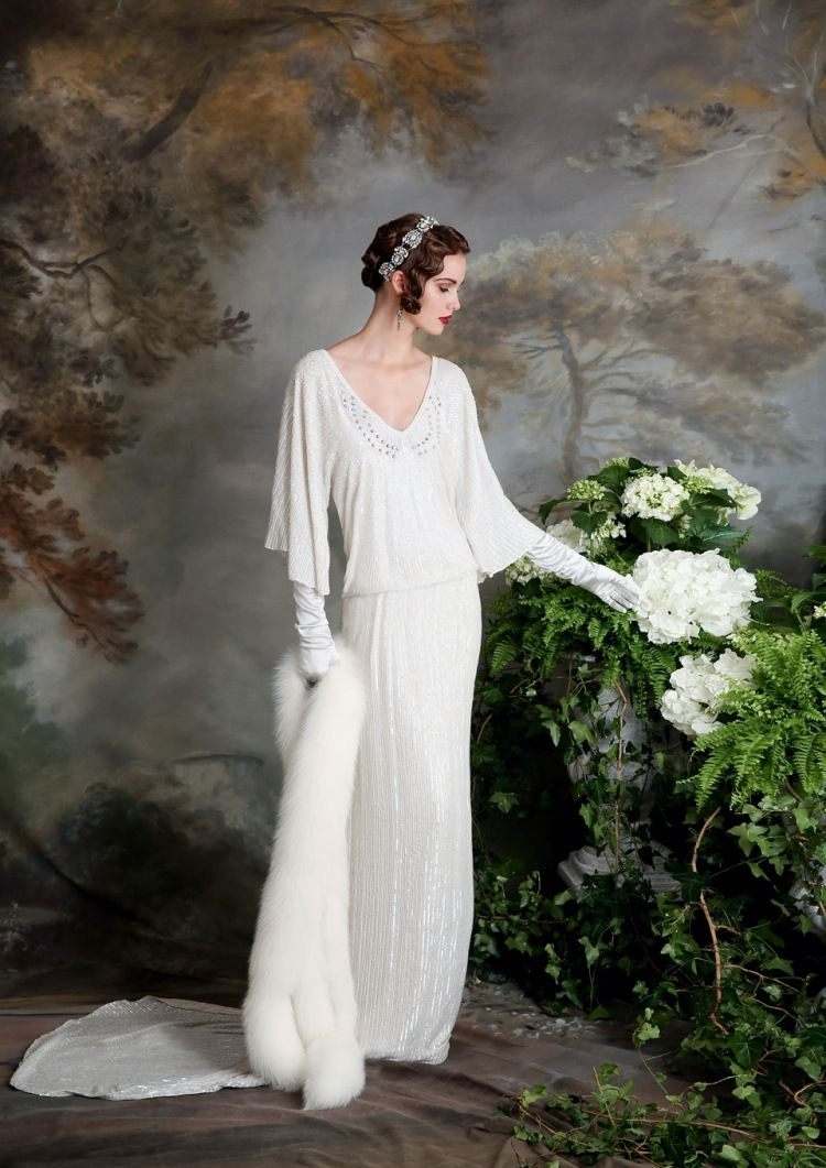 The hairstyle must be smooth. An ideal option would be a short haircut with sharp corners and a straight bang, and for long hair – beautiful waves, laid on one side. The hairstyle should include some kind of hair accessory. It can be a rim with rhinestones, a hair clip with feathers, a bridal cap, a hair chain, or a hat decorated with a veil, a brooch or feathers. Do not forget about accessories: pearl beads and bracelets, guipure gloves, antique brooches, large chandelier earrings, boas, fur capes – all these are essential for the Art Deco bride.