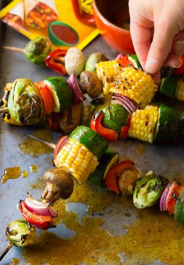 Cut the corn into rounds. Cut the zucchini into 1-inch (2.5 cm) rounds. Cut the bell pepper and onions into 1 1/2 inch (3.5 cm) square pieces. Discard pepper seeds. Trim the Brussels sprouts.