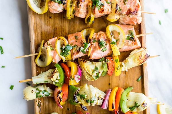 Over a very hot grill, cook the skewers for 4-6 minutes. Flip, and cook the other side until the salmon is cooked throughout and veggies are done.