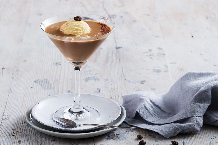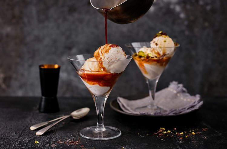 Take the prepared ice cream from the freezer and, working quickly, drizzle over the espresso martini and the hot espresso.