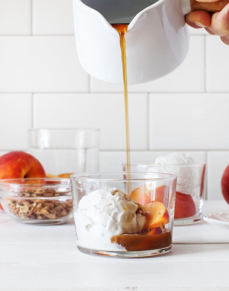 Assemble each affogato in a glass with peach slices, a scoop of vanilla ice cream, and a shot of freshly brewed espresso.