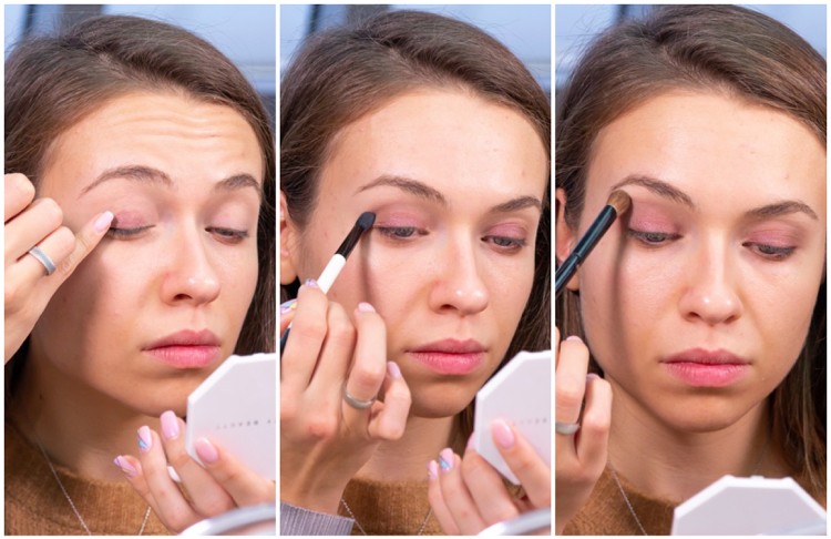 Apply dusty rose eyeshadow all over the lid with your finger. Define the crease with taupe eyeshadow and a defined crease brush. Blend the edges using a fluffy blending brush to create a smoky effect.