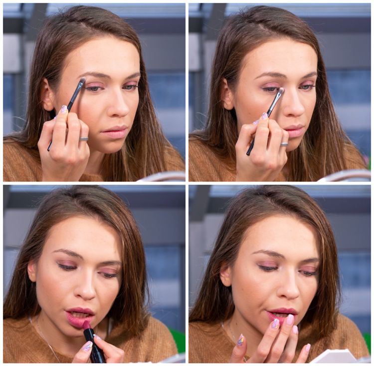 Highlight the inner corners of the eye and the brow bone with a packing brush. Finally, apply the lipstick and dab it with your finger to create a matte look.