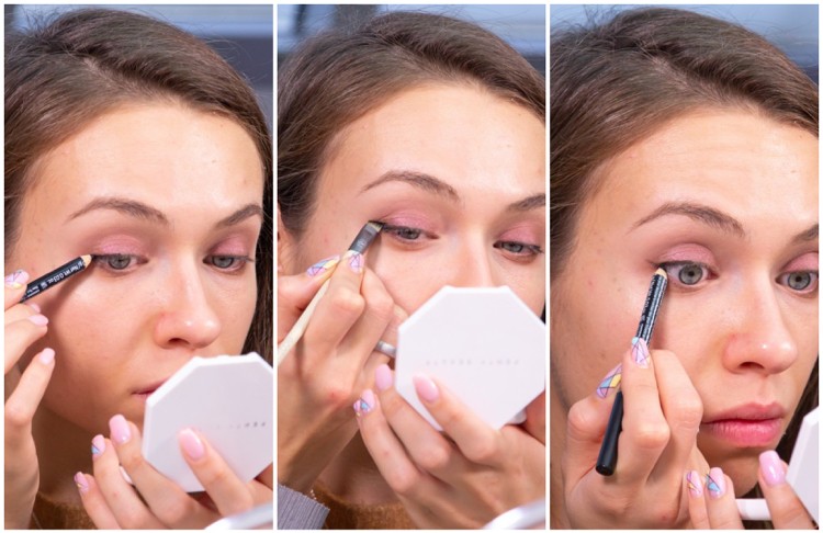 Line the outer corner of the upper lash line with a black eye pencil. Use an angled brush to elongate the liner and to create a wing. Line the upper waterline as well.