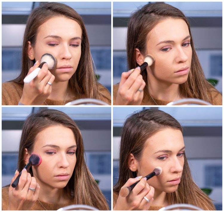 Set the rest of the face with a big fluffy brush. Use the kabuki brush to apply some bronzing powder on the cheekbones and forehead. Apply blush with the fluffy angled brush. Use the tapered fluffy brush to apply the highlighter to the tip of the nose and above the cheekbone.