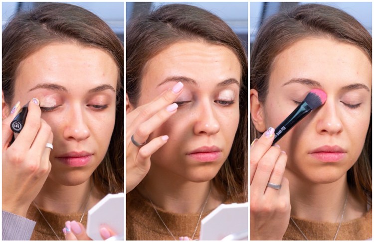 Apply concealer under the eyes, in the center of the forehead, on the nose and on the cupid’s bow. Apply setting powder under the eyes using a flat foundation brush.