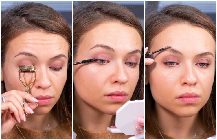 Now use eyelash curler to bend the eyelashes and make the eyes look bigger. Apply mascara to the upper eyelashes. Finally, apply eyebrow gel to set the eyebrows in place and to make them look thicker. Go over the eyebrows with the sponge to make them look softer and to absorb any excess product