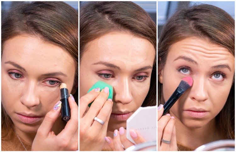 First prime the eyelids with a little concealer. Use the makeup sponge to evenly distribute the product. Then apply the setting powder with a flat foundation brush. It ensures that the cover layer also holds.