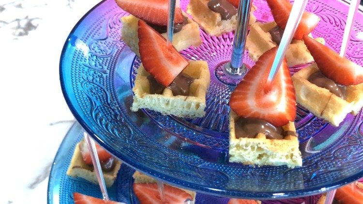Secure the strawberries on the waffles with toothpicks or cocktail sticks.