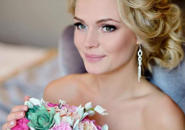 - Brides with blue eyes should focus their makeup exactly on the eyes. Tenderness, lightness – these are the main rules for blue eyes. To emphasize their natural beauty, pink and crimson shades are suitable while light violet, indigo and green palette will help you give a spectacular look to blue eyes. Gray or brown eyeliner is recommended. Shades of coral and peach-pink will look good on the lips.