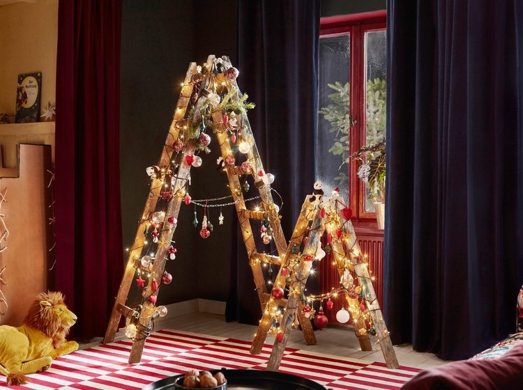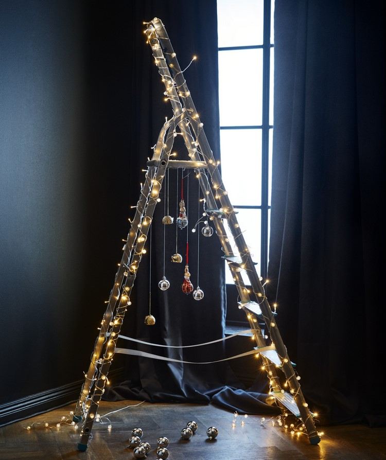 It will take you only a few minutes to bring in the ladder in the room and open it to have the triangular silhouette of a Christmas tree. You can decorate it with string lights and garlands, you can even add shelves and arrange a festive Christmas display.