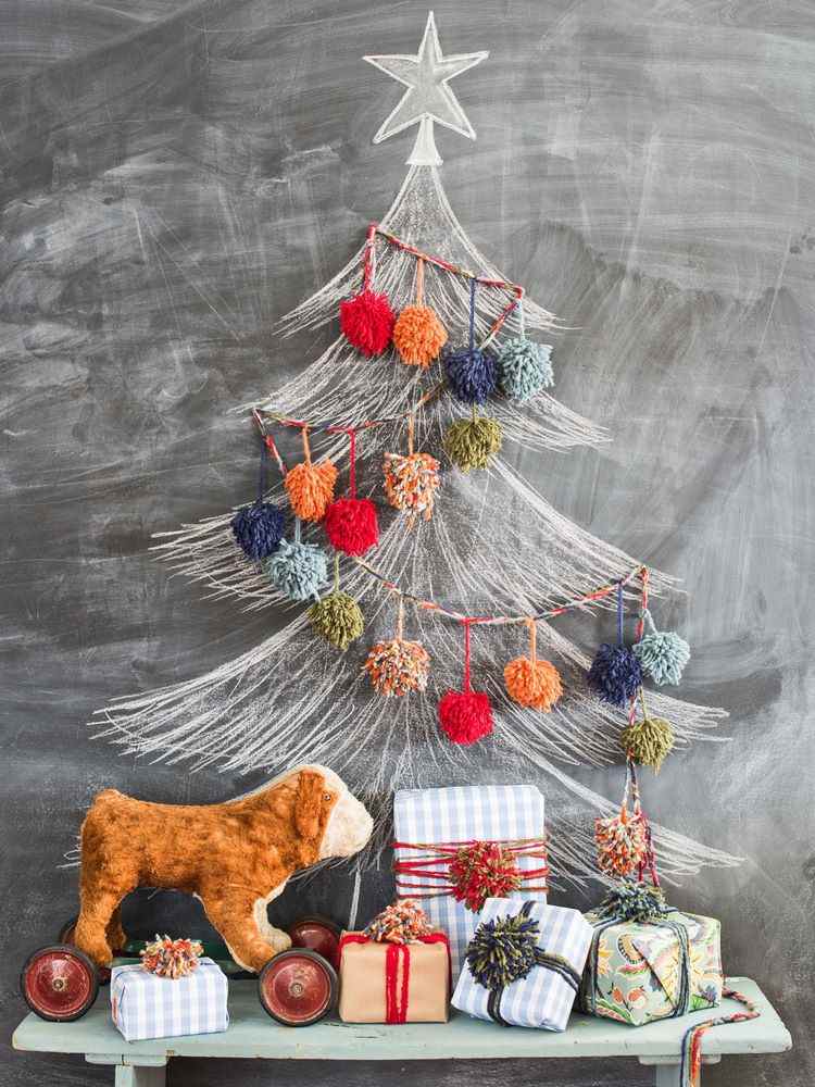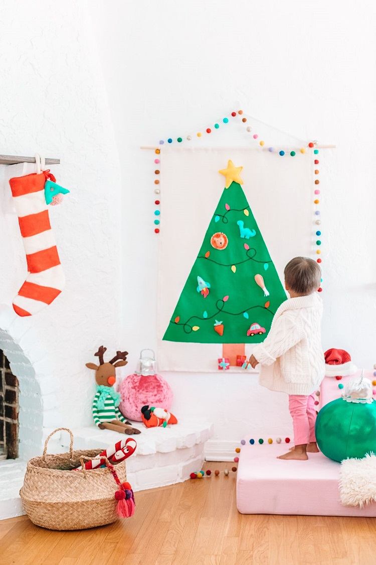 Another option for a simple but spectacular Christmas tree is to cut out the shape from cardboard or fabric like felt, and simply install it on the wall. A garland and string lights complete the composition.