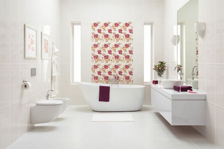 When decorating walls and choosing furniture, you can opt for one of the off-white shades – slightly bluish or beige. The first shade will give the room a colder, and the second – a warmer look. If the interior is based on white and blue tiles, then you will need to focus on blue elements for the decor. It is easier to work with creamy tiles as you can use any color for accessories. Brown, violet, burgundy – any of them will look quite cheerful in the decor of a white bathroom.