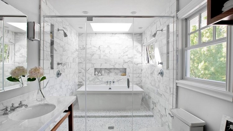 Marble -It is difficult to find material more noble and aristocratic than marble. Streaks of gray, pink and bluish shades can add a touch of sophistication to the bathroom and make the interior look truly expensive.